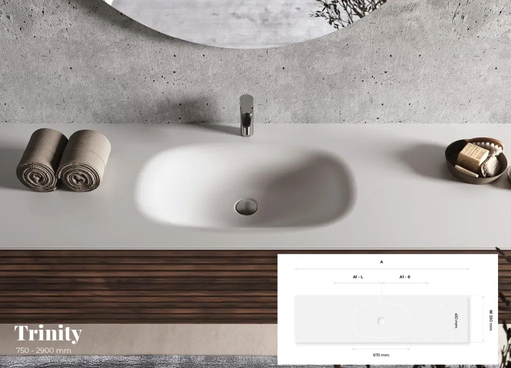 To perfectly adapt to spatial requirements, we also offer Trinity vanity tops, which are available in lengths ranging from 750 mm to as much as 2900 mm.