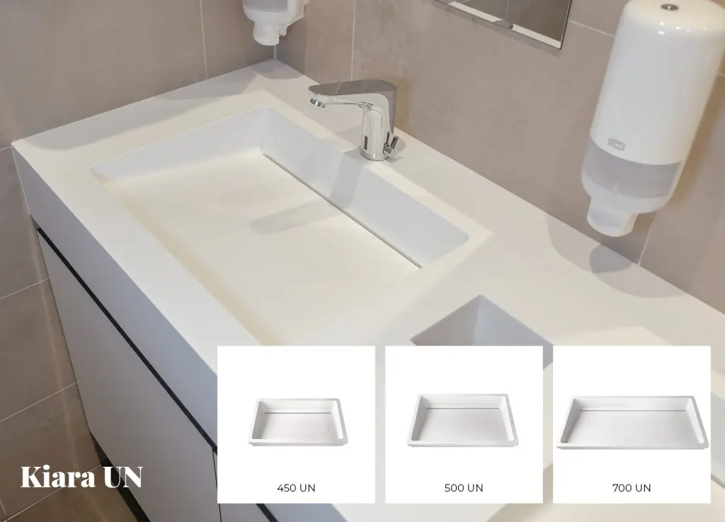 The washbasin model, which was previously assembled by bonding, is now made by casting in a mold, ensuring greater strength and uniformity of shape. It is equipped with a drainage channel for efficient water flow and a minimalist seam for an elegant and smooth transition. These features make it particularly suitable for public spaces, where durability and functionality are of utmost importance.