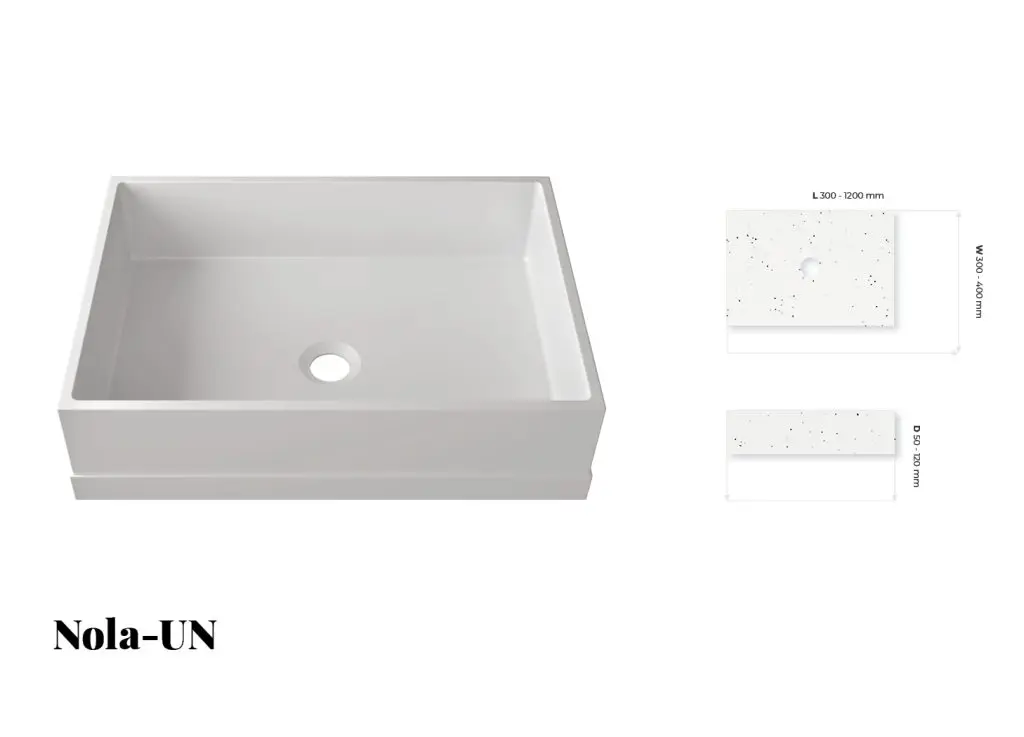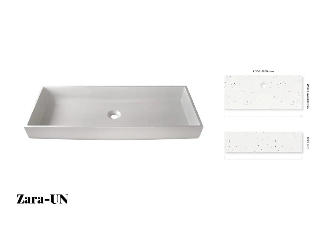 Nola and Zara are new lines of custom made washbasins that we manufacture. Both models offer a wide range of colours—Zara is available in 9 colors, while Nola boasts an impressive selection of 60 colours, which is its greatest advantage. The sizes of both models are adjustable, as customers can choose dimensions ranging from 300 mm to 1200 mm. These washbasins are ideal for use in bathrooms where customers want to customize the appearance according to their preferences.