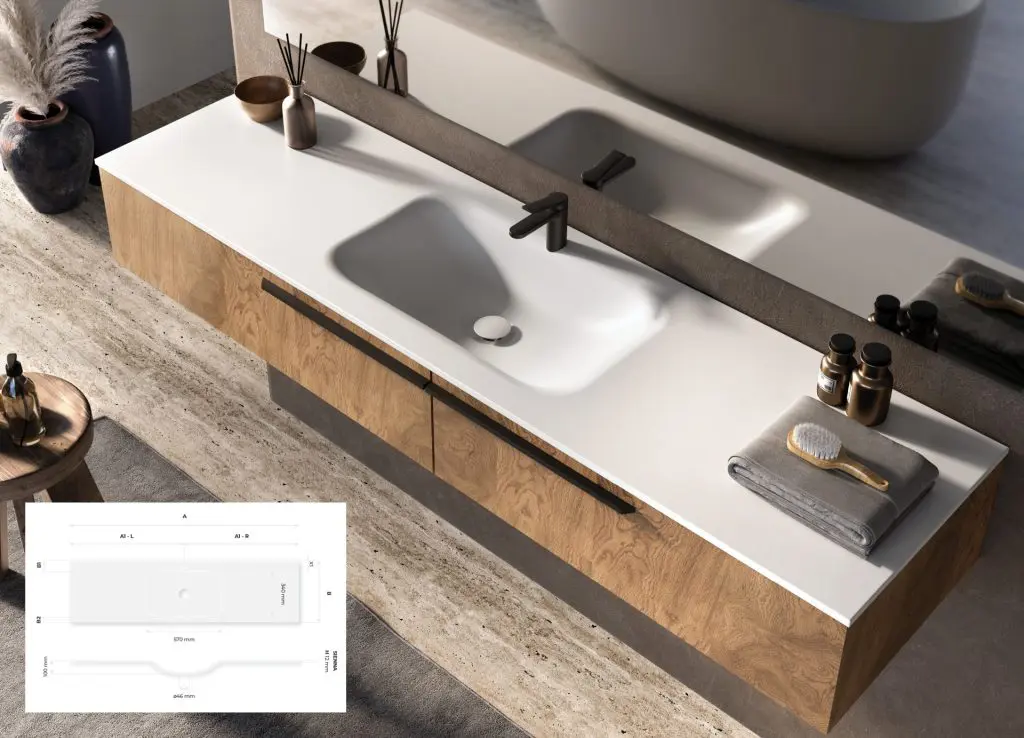 Sienna-E: A wall-mounted vanity top suitable for spaces where aesthetic simplicity is key. Flexible dimensions from 750 to 2900 mm.